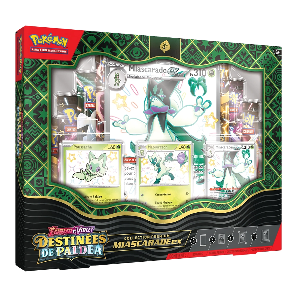 Découvrez l’évolution finale des Starters de Paldea avec Miascarade-ex chromatique ! Ce coffret premium inclut également les cartes promos du Pokémon de base et de Niveau 1, pour mettre en valeur toute la chaîne évolutive dans un protecteur dédié à trois cartes. Une carte grand format du Pokémon-ex chromatique vedette et de nombreux boosters Écarlate et Violet – Destinées de Paldea complètent cette collection pour enrichir votre deck.