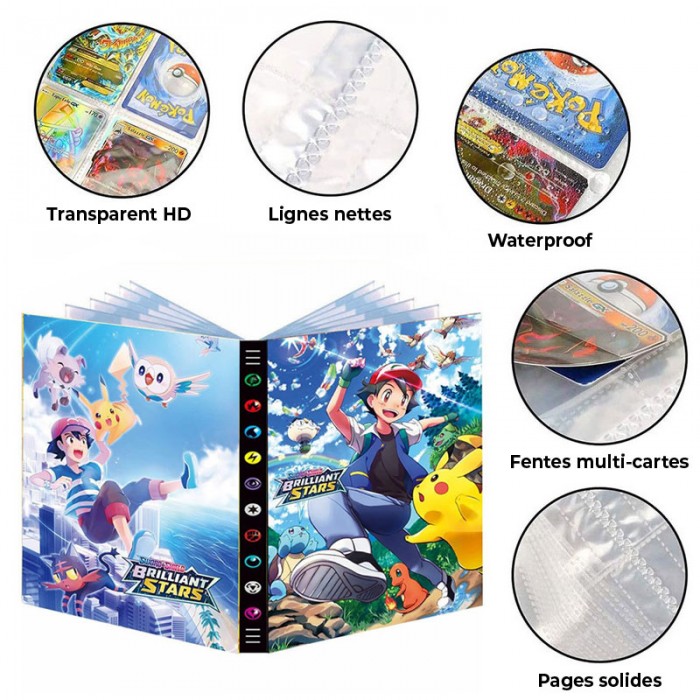 Ce superbe classeur, mesurant 30 cm x 22,5 cm x 2 cm lorsqu’il est fermé, est composé de 24 pages comportant 9 grilles chacune, permettant ainsi de ranger jusqu’à 432 cartes Pokémon.